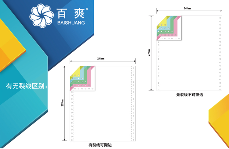 蓝百爽打印纸241-3层彩1/2 三联二等分撕边